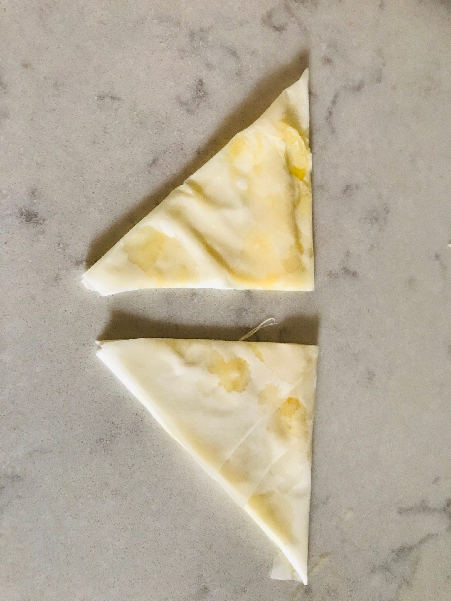 8. Pak je filodeeg, leg deze op je werkblad en snijd die in 3 repen. Leg deze aan de kant. Pak een reep en besprenkel deze met gesmolten boter. Leg er een volgende op. Besprenkel deze ook met gesmolten boter. Vouw een een driehoek van de filodeeg. Snijd deze door midden.